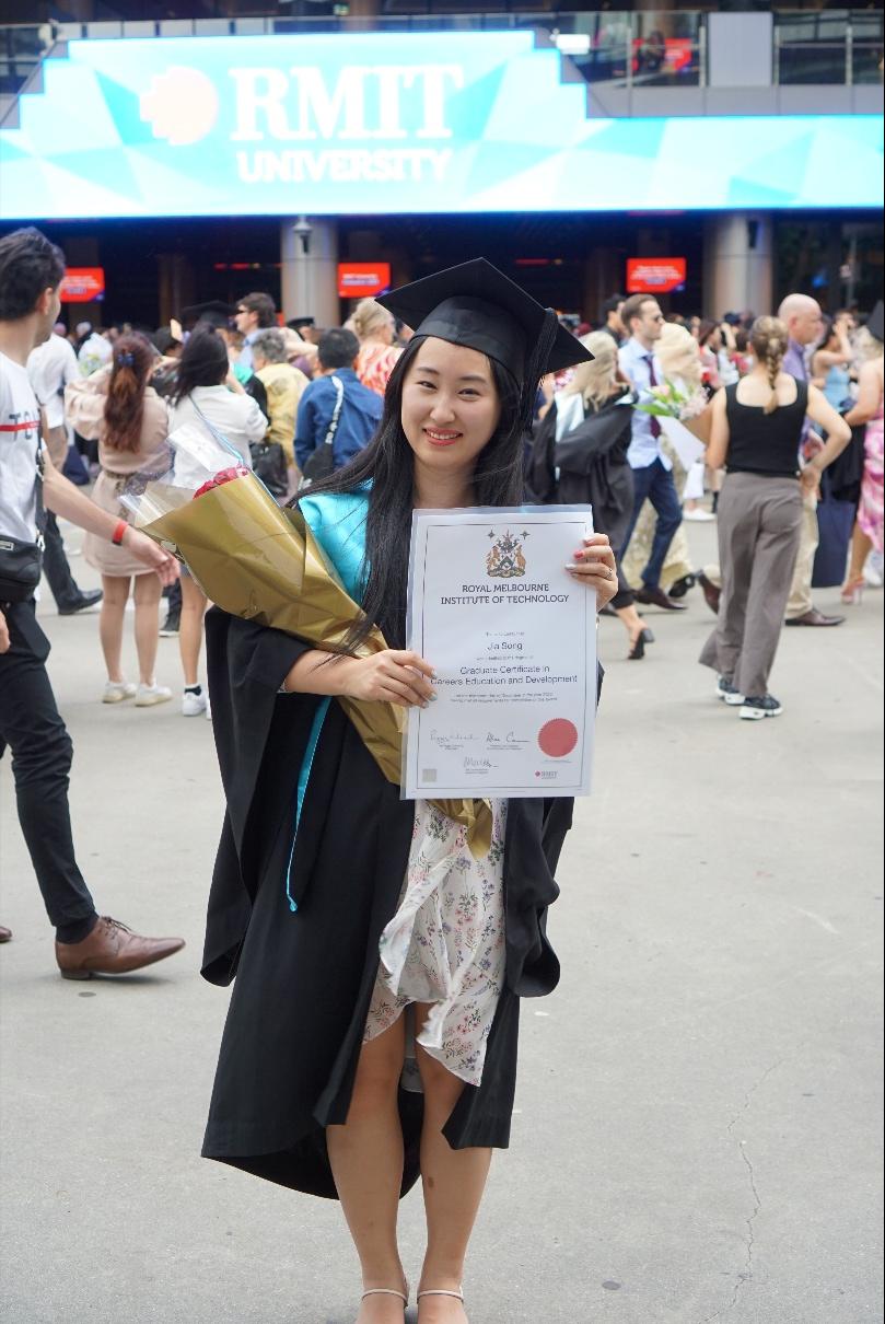 宋佳,2008级朝鲜语专业学生,曾担任学院学生会学习部副部长职务。她学业成绩优异,赴韩国庆熙大学攻读工商管理硕士学位期间,荣获全额奖学金。硕士毕业后在首尔工作四年,后赴澳大利亚墨尔本定居。现任蒙纳士(莫纳什)大学职业顾问,主要负责学生就业指导项目及校长教学卓越奖(Vice-Chancellor's Education Excellence Awards)申报管理工作。