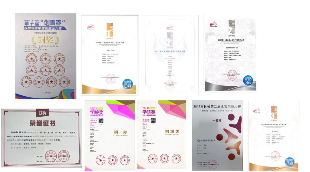 竞赛驱动,创新提升:积极组织学生参加“大广赛”“吉林省公益广告大赛”“互联网+大学生创新创业大赛”等竞赛,以赛促教、以赛促学,激发学生的创意和创新思维,多年来斩获百余项荣誉,提升了学生的专业素养和行业适应能力。