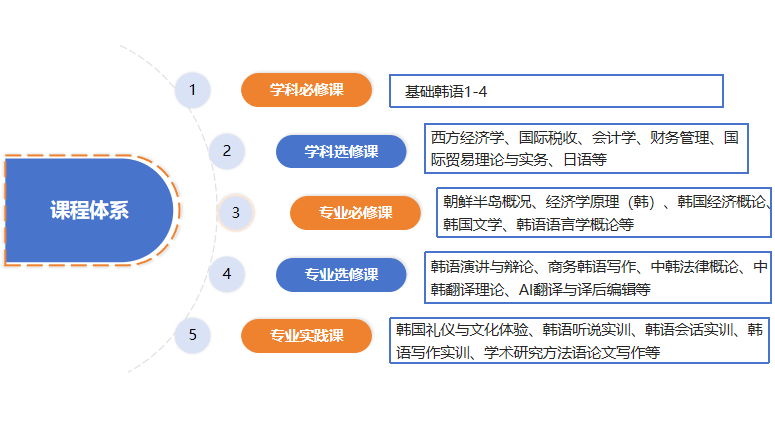 知识要求:学生应掌握朝鲜(韩)语语言知识、朝韩文学知识、朝鲜半岛区域与国别知识、经贸知识,熟悉中国语言文化知识,了解人文社会科学与自然科学基础知识,形成跨学科知识结构,体现经贸方向特色。