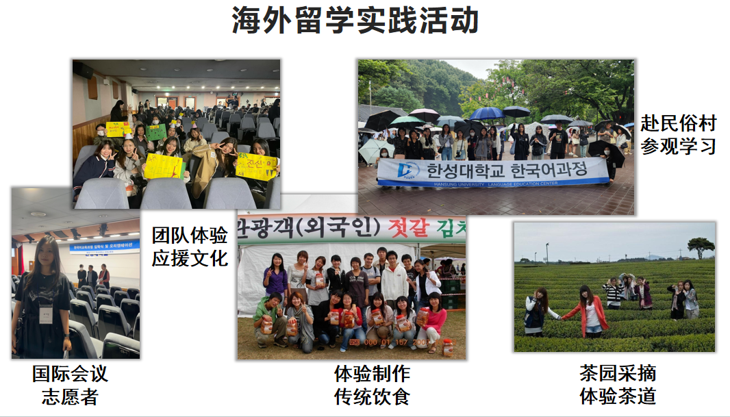本专业秉持开放合作理念,长期与韩国多所高校开展国际联合培养工作。学生通过赴韩留学的宝贵经历,全面提升了涵盖语言能力在内的各项软实力。与此同时,学生们得以更为深入、全面地了解韩国社会实际情况,进一步拓宽国际视野,切实感悟“读万卷书、行万里路”的真谛。