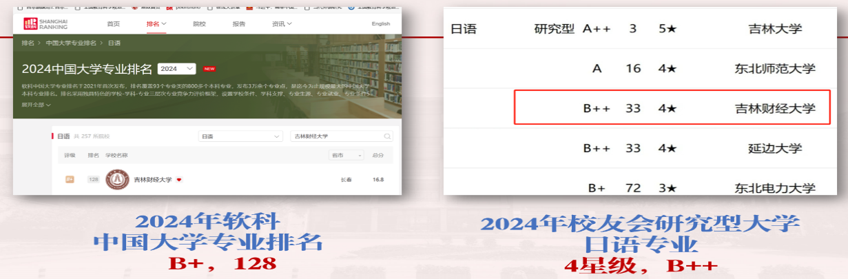 在全国第三方大学评价机构艾瑞深校友会网撰写完成、科学出版社出版发行的《2024校友会中国大学排名:高考志愿填报指南》中,被评为“日语专业排名(研究型)”4星级专业,B++等级。在2023、2024软科中国大学专业排名中,永利官网日语系评价等级为B+。