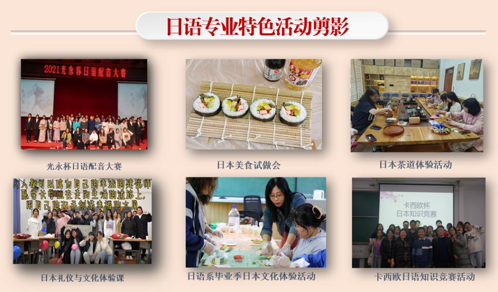 日语专业确立了“日语+经贸+国际化”复合型经贸日语人才培养目标。在专业方向上,紧紧围绕新文科建设,凸显“复合型、国际化”的经贸日语特色;与开设经济类专业的日本高校在人才培养、科学研究等领域开展深度合作。