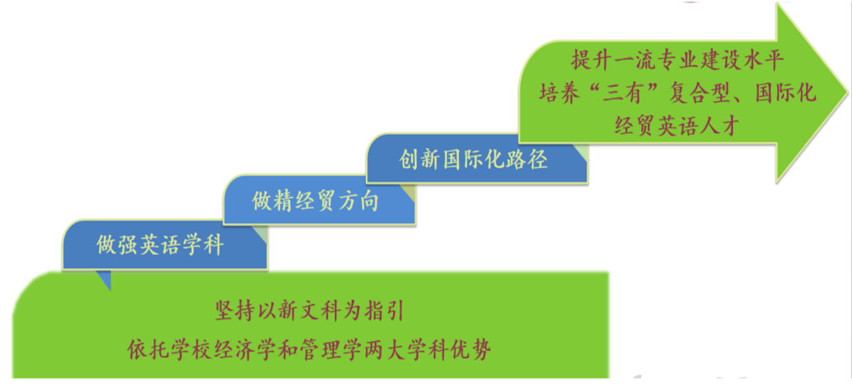 随着全球化的发展和我国在国际舞台的地位越来越重要,我们国家需要更多既精通外语又精通经贸知识,并且具有国际化视野和家国情怀的复合型人才。因此,本专业坚持以新文科建设为指引,依托学校经济学和管理学两大学科优势,构建了培养复合型、国际化的“外语+经贸”人才的培养模式。本专业在做强英语学科的同时,深化经济学、管理学等学科的交汇融通,做精经贸方向;在不断创新国际化路径,开拓学生国际化视野的同时,强化全过程育人、全方位育人,培养具有家国情怀,能够讲好中国故事、树立好中国形象的新型外语人才。