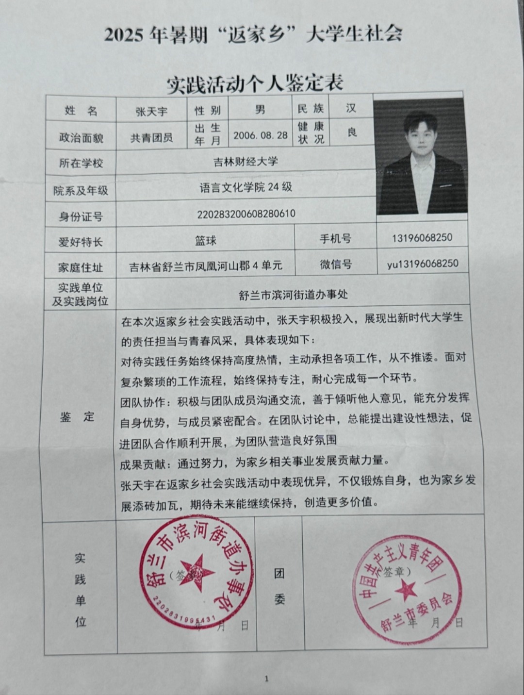 为深入学习贯彻习近平新时代中国特色社会主义思想,全面落实习近平总书记关于青年工作的重要指示精神,yl9193永利集团团委围绕“盛夏归故里,青春践使命”主题,精心组织开展2025年暑期“返家乡”社会实践活动。活动通过动员青年学子深入基层一线,在政务实习、乡村振兴、文化传播等多元化实践平台中,将专业知识转化为服务家乡建设的实际成果。吉财学子以知行合一的态度投身实践,在服务中锤炼意志,在奉献中提升素养,用实际行动诠释新时代青年的责任担当,充分展现了踔厉奋发、勇毅前行的精神风貌。