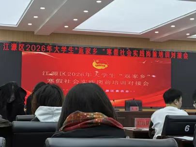 实践的起点,是江源区2026年大学生“返家乡”寒假社会实践岗前培训对接会。走进宽敞的会议大厅,红色背景板上“坚定信念跟党走,牢记使命勇担当”的标语格外醒目。会上,区团委的老师向我们介绍了基层实践的意义,几位优秀的返乡大学生代表分享了他们在乡村振兴、民生服务等岗位上的经历。当听到一位学姐讲述她帮助独居老人申请养老补贴的故事时,我第一次真切感受到“民政工作无小事,一枝一叶总关情”的分量。那天的培训不仅让我明确了岗位职责,更在我心中埋下了一颗“扎根基层、服务群众”的种子。