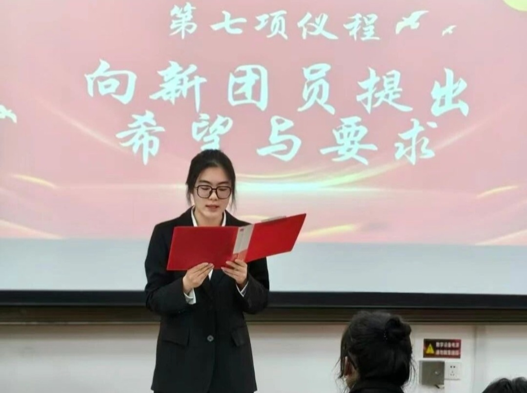 在优秀团员代表石雨欣的带领下,新团员高举右拳,庄严宣誓:“我志愿加入中国共产主义青年团……为共产主义事业而奋斗!”铿锵誓言回荡全场,定格下青年矢志不渝的信念。