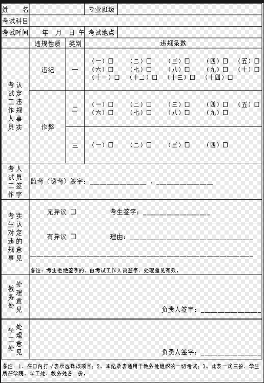第七条 考试工作人员在考试过程中发现考生实施本规定第三条、第四条所列考试违纪、作弊行为的,应当及时予以纠正并如实记录在《永利官网学生考试违规记录单》(见附件,下简称违规记录单);对考生用于作弊的材料、工具等,应予暂扣。